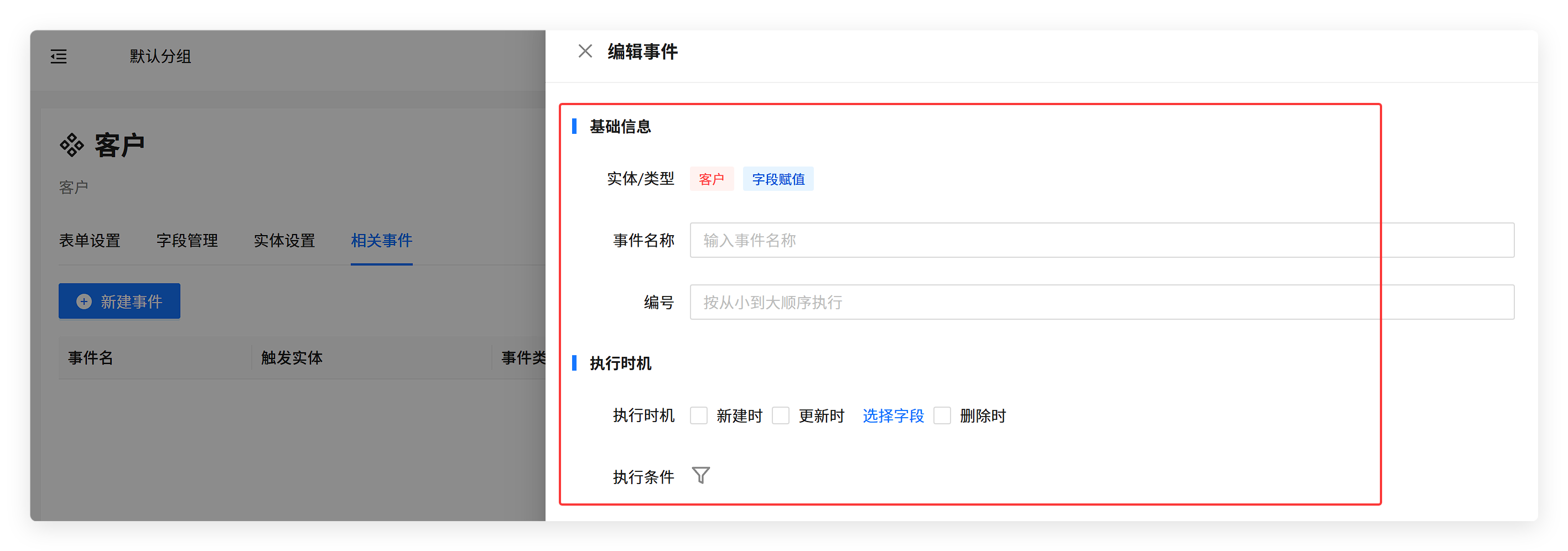 这里我们以客户、联系人实体为例,一个客户下有多个联系人。因此联系中有个字段引用了客户,我们取名为所属客户。我们创建一个统计回填的事件,在操作联系人时,把客户下联系人的数量,回填到客户的联系人数量字段中