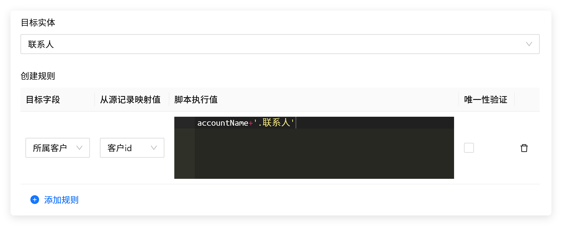 目标实体需要自动创建的记录对应实体创建规则一组记录字段数据回填的规则集合目标字段回填的字段从源记录映射值将会把源记录的值映射到目标字段中脚本执行值将会把脚本执行结果映射到目标字段中,脚本参考后台脚本唯一性验证勾选后,在目标记录按照规则构建完成之后,将会检查目标实体中是否已经存在相同的记录,如果存在则不创建。勾选多个字段,将按照并且的关系来验证