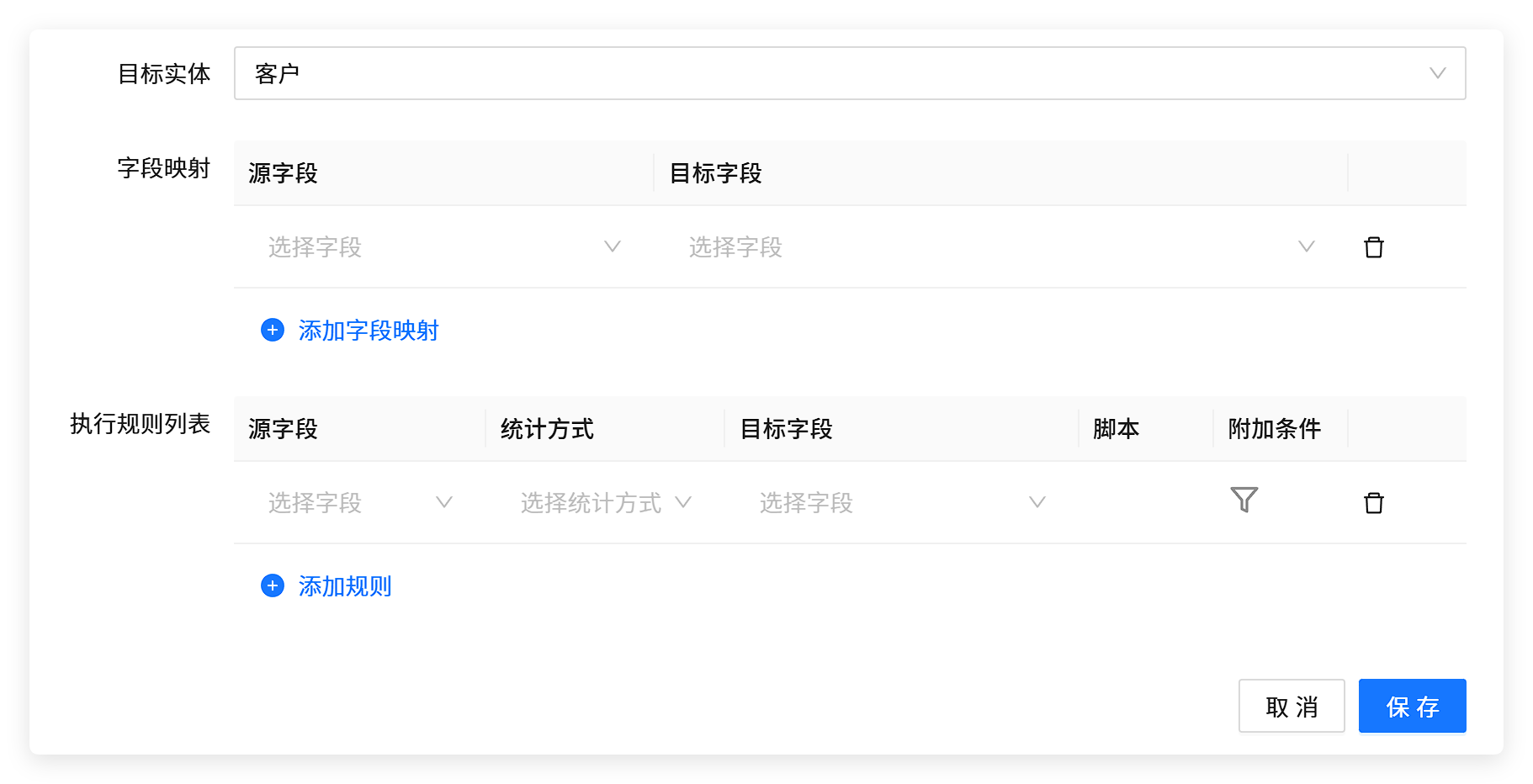 执行规则列表当根据字段映射匹配到目标记录后,进行字段赋值的一组规则源字段当前记录的字段统计方式计数将源字段的值进行计数统计求和将源字段的值进行求和统计平均值将源字段的值进行平均值统计最大值将源字段的值进行最大值统计最小值将源字段的值进行最小值统计脚本执行按照脚本结果来给字段赋值,脚本参考后台脚本