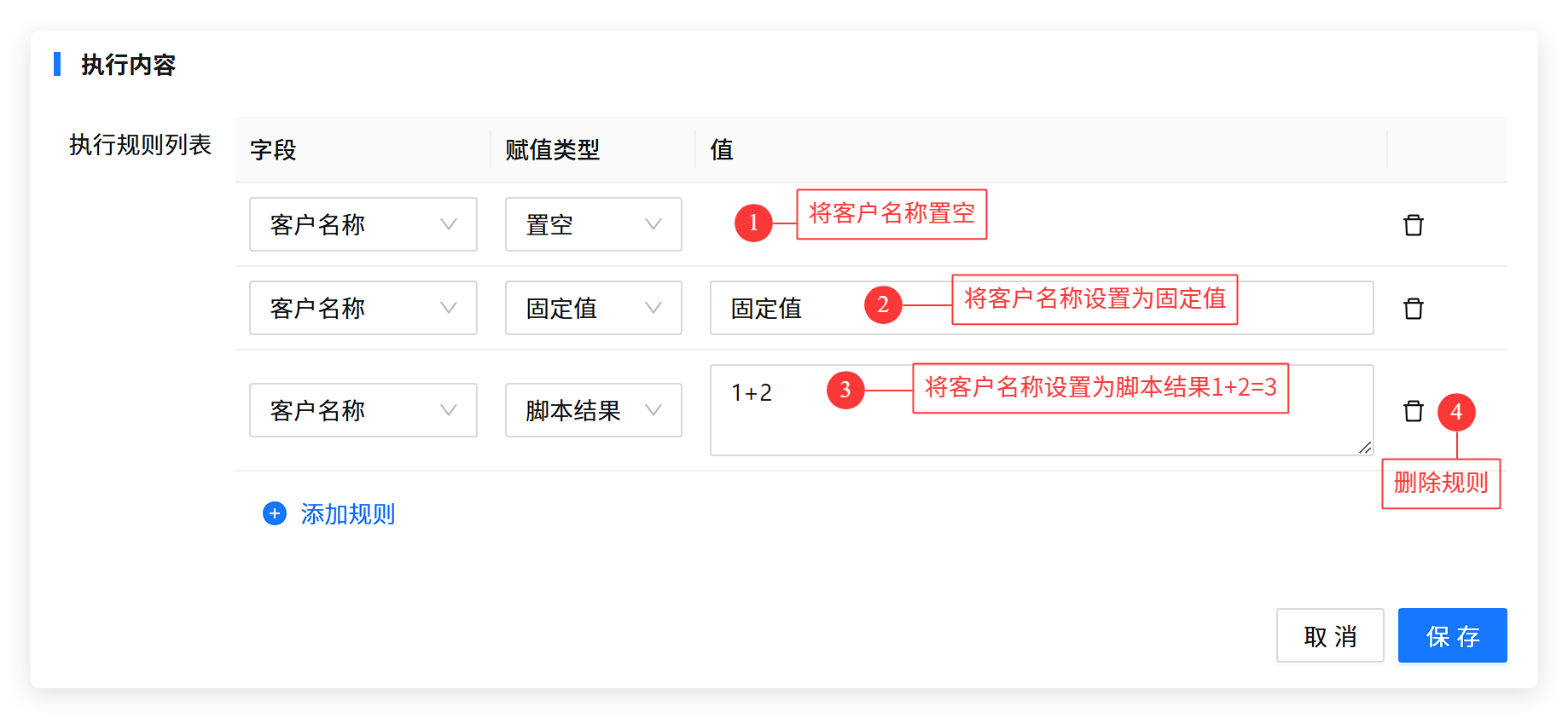 执行规则列表一组记录字段赋值的规则集合字段需要赋值的字段赋值类型置空将字段值置空固定值按照字段类型来指定一个固定值脚本结果按照脚本结果来给字段赋值,脚本参考后台脚本