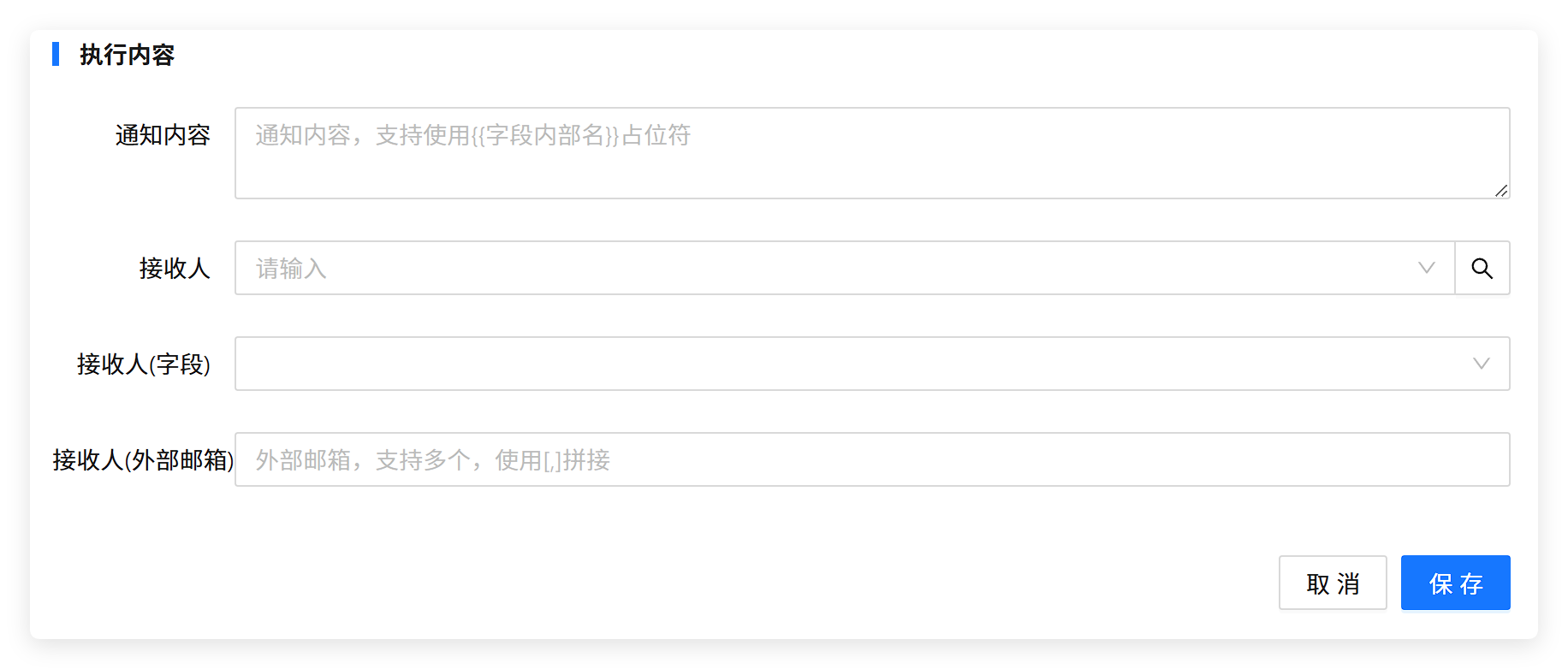 通知内容通知内容接收人接收通知的用户接收人字段选择记录中的引用用户的字段,作为通知接收人接收人(外部邮箱)填写接收通知的外部邮箱