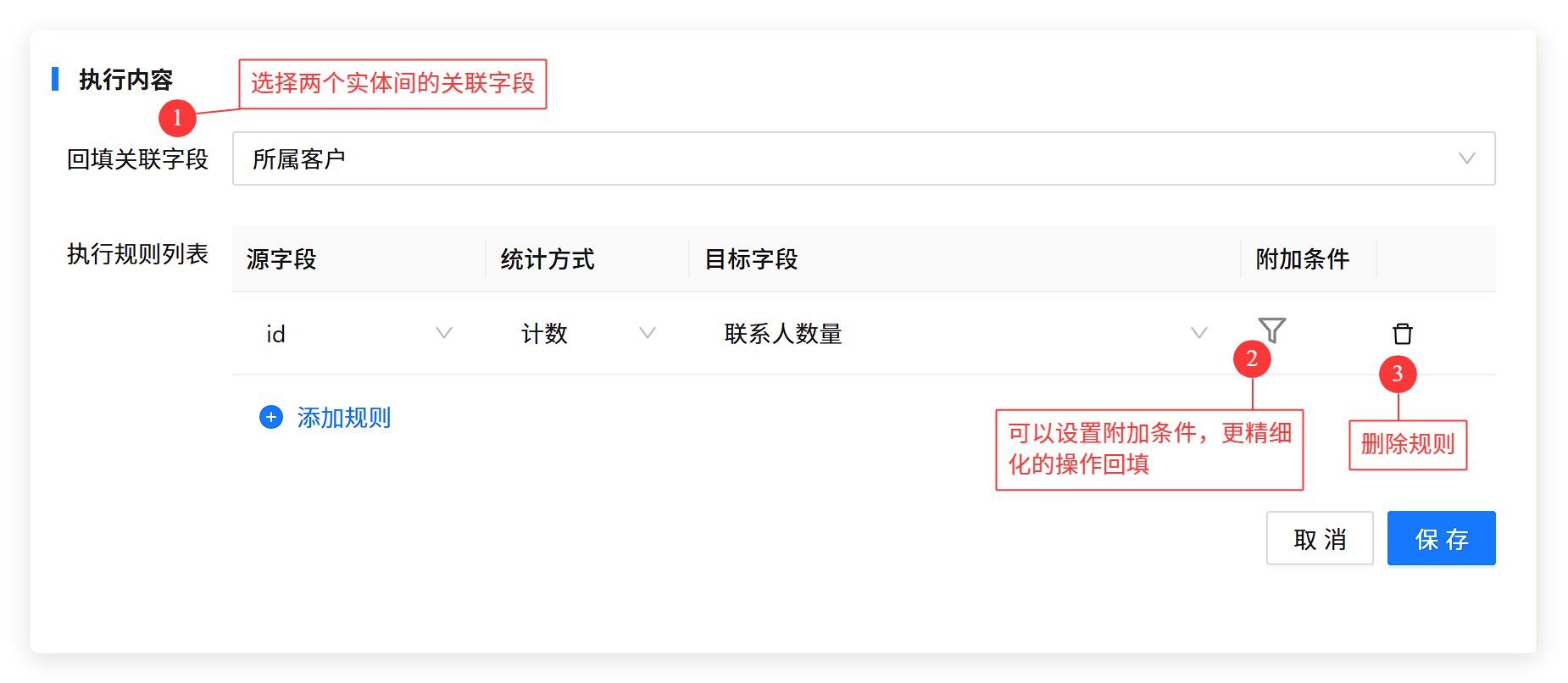 回填关联字段将N的一方实体的数据,按照规则统计到其回填关联字段对应的记录中执行规则列表一组引用统计规则集合源字段需要统计的N的一方实体的字段,也就是当前记录的字段统计方式计数将源字段的值进行计数统计求和将源字段的值进行求和统计平均值将源字段的值进行平均值统计最大值将源字段的值进行最大值统计最小值将源字段的值进行最小值统计脚本执行按照脚本结果来给字段赋值,脚本参考后台脚本